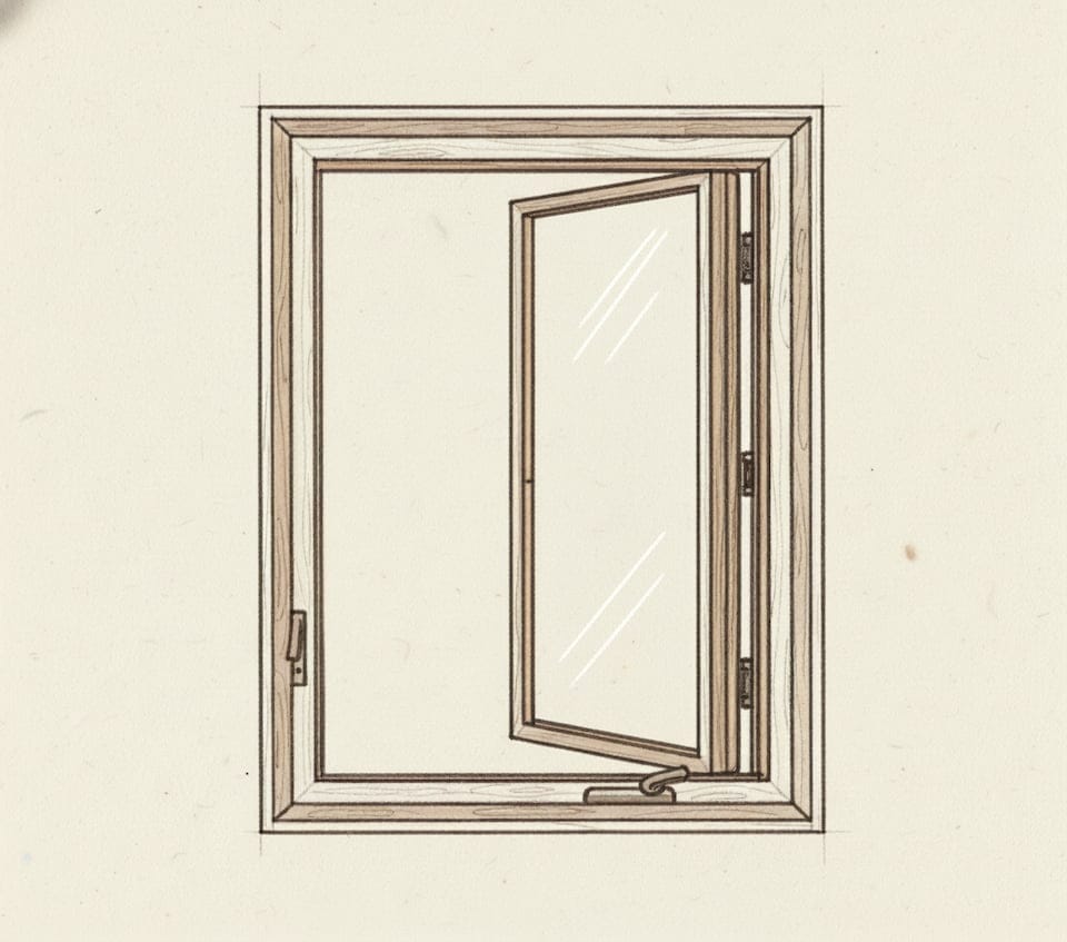 Hinged windows that swing outward like a door, operated with a crank handle.